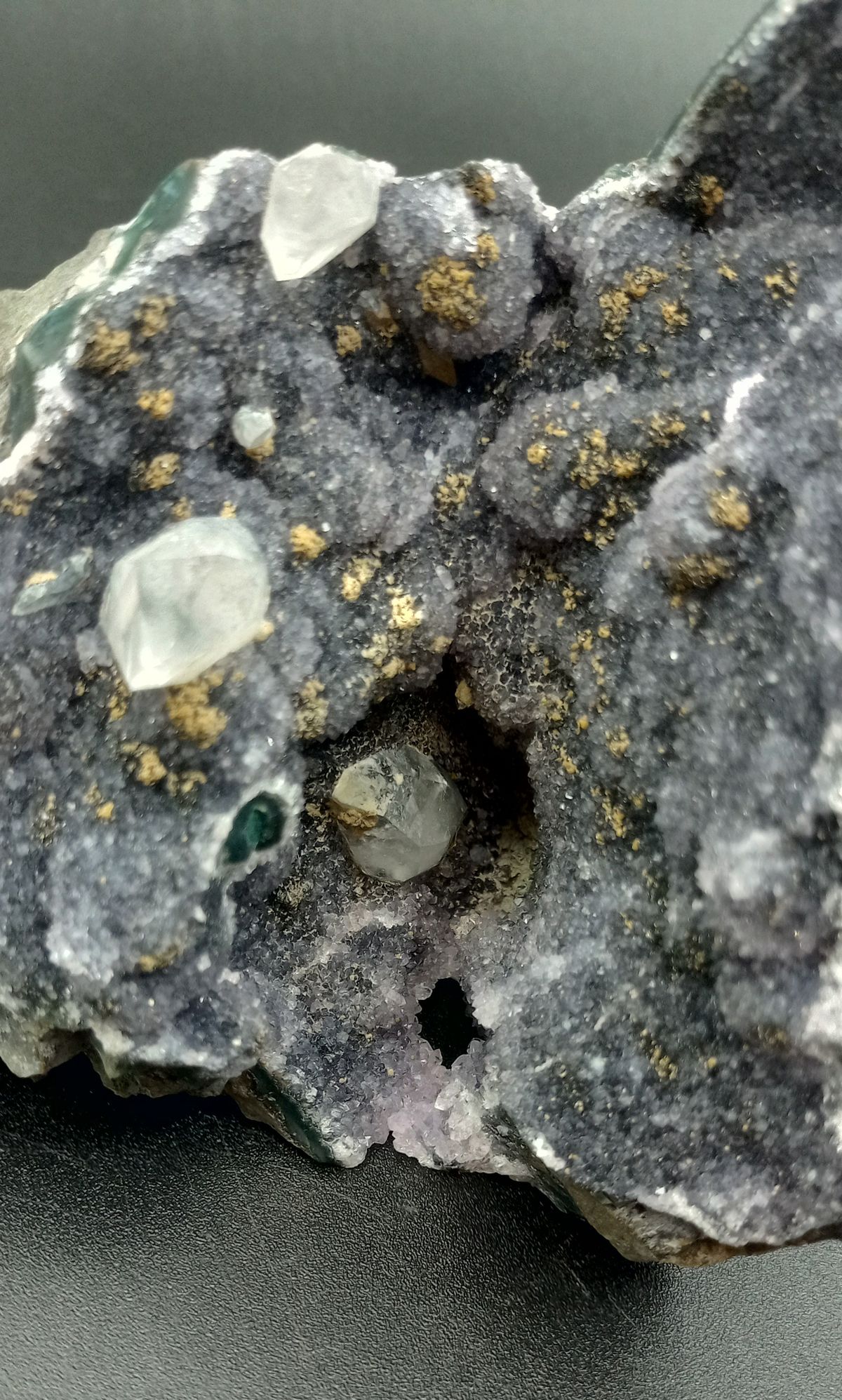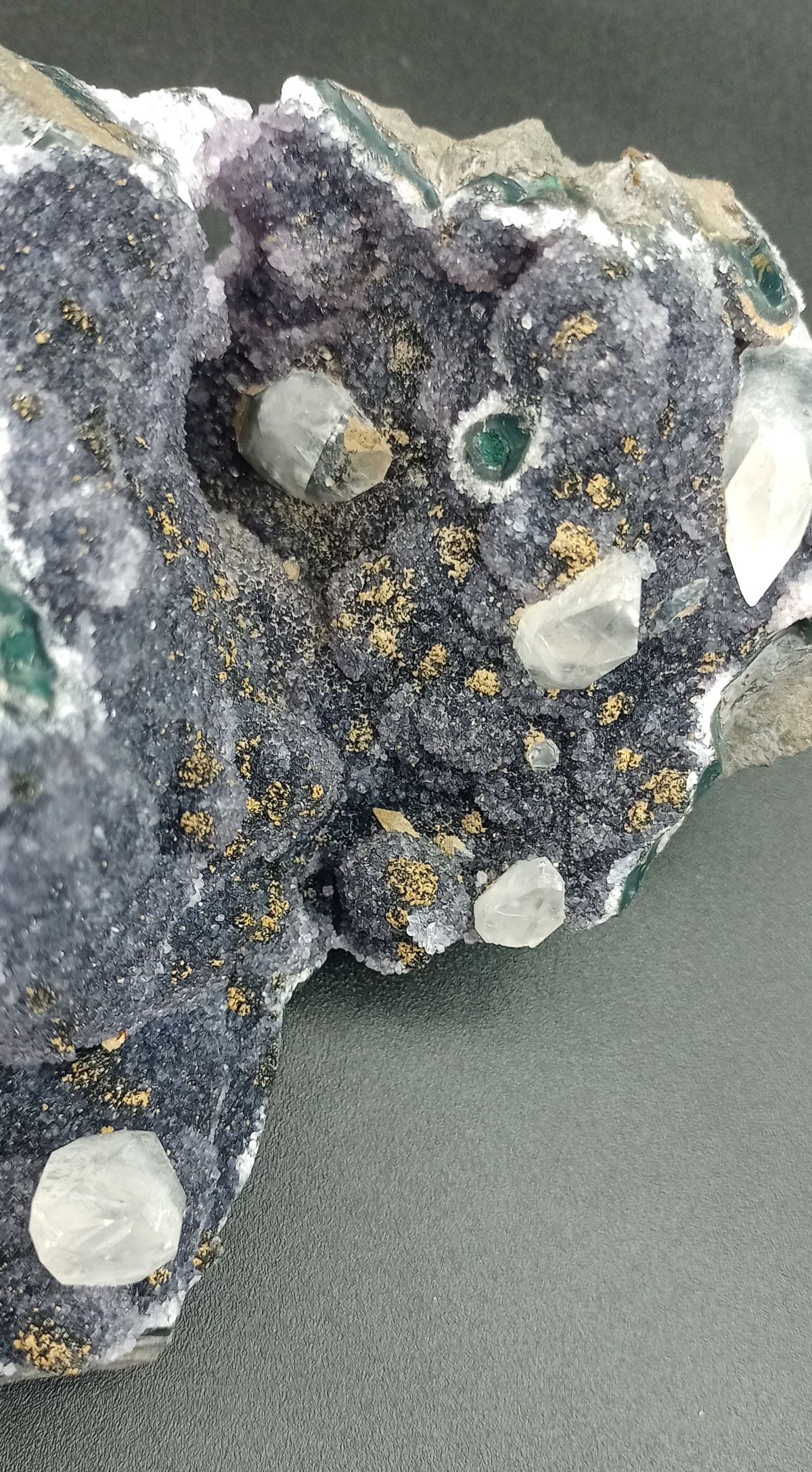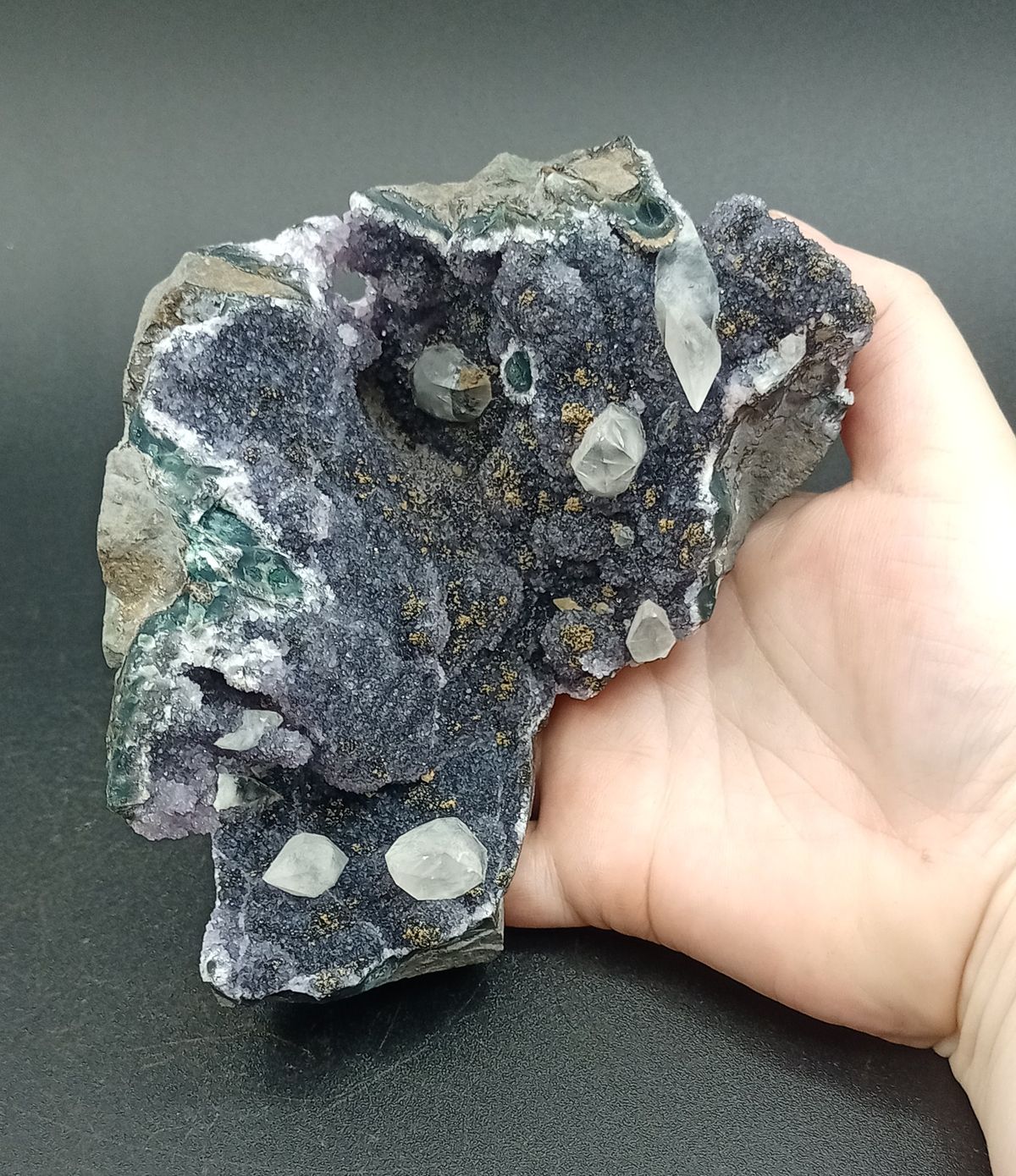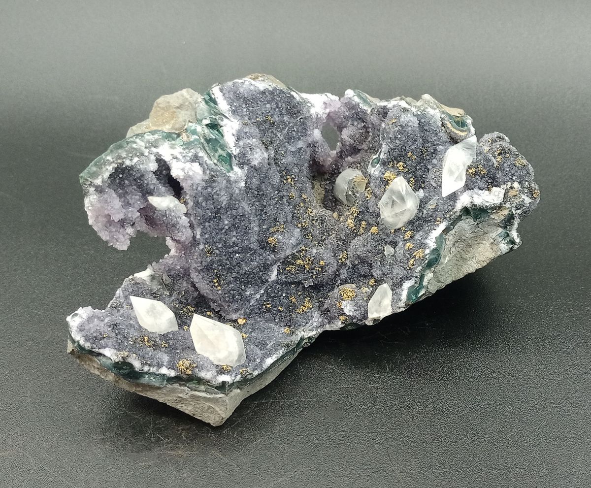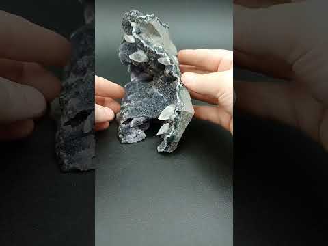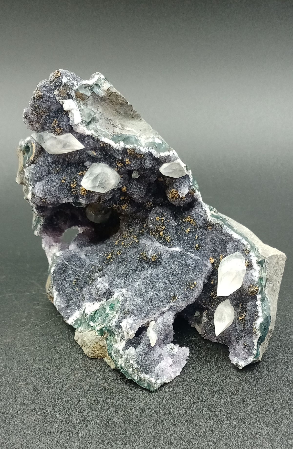 Ejemplar de Amatista en geoda con cristales de Calcita perfectamente formados cuyas medidas son: 115 x 112 x 79 milímetros. Midiendo los cristales de Calcita hasta 30 mm de largo. Procedencia: Artigas, Uruguay