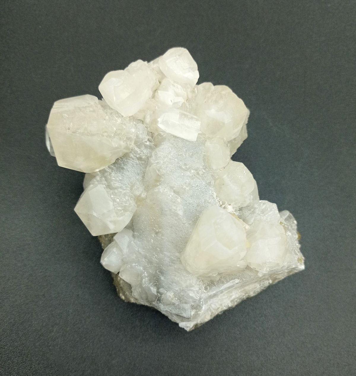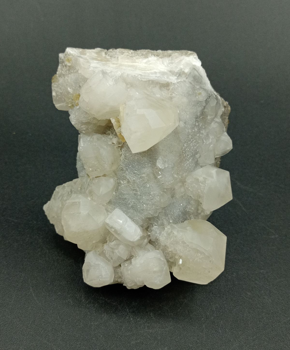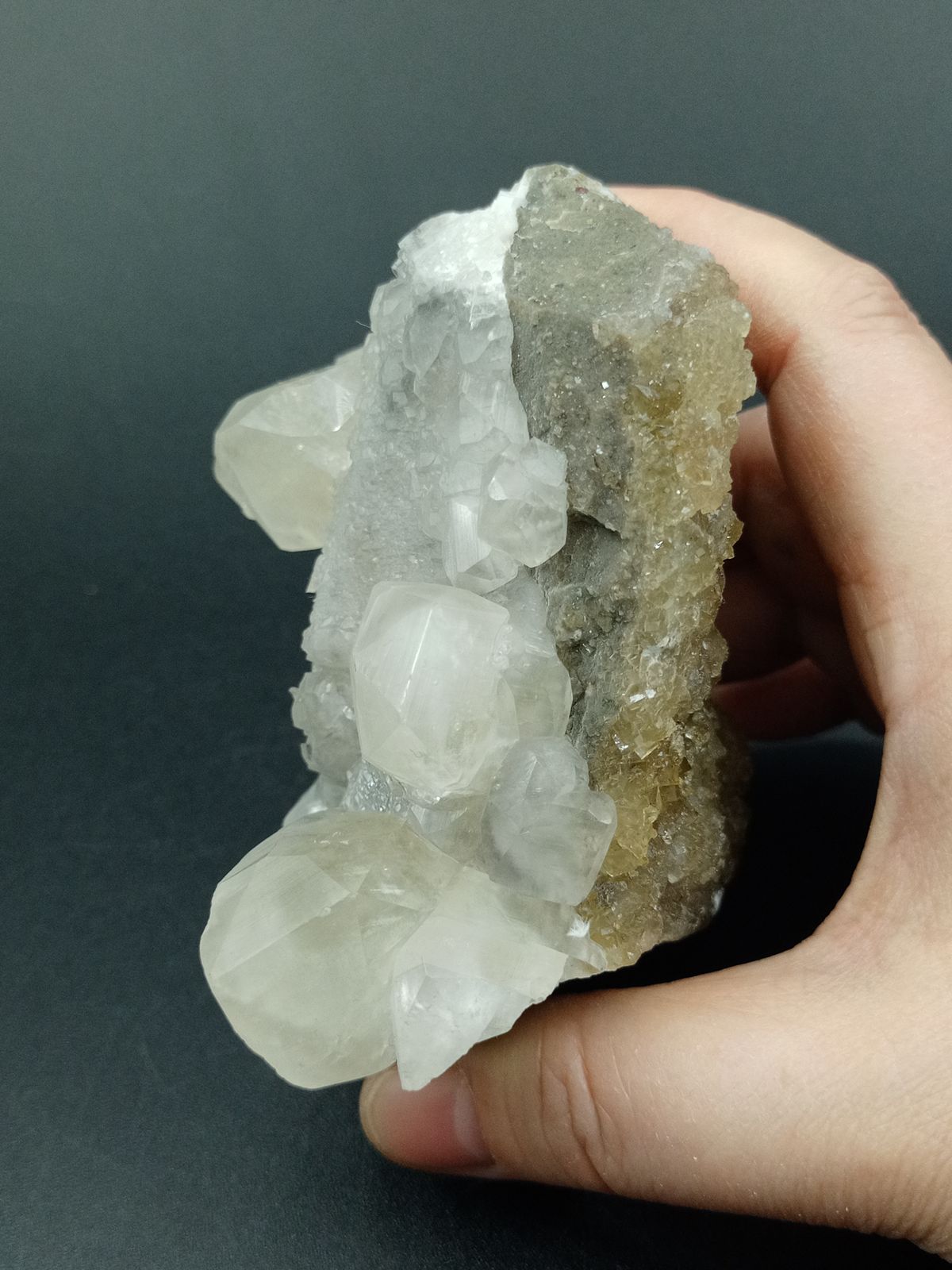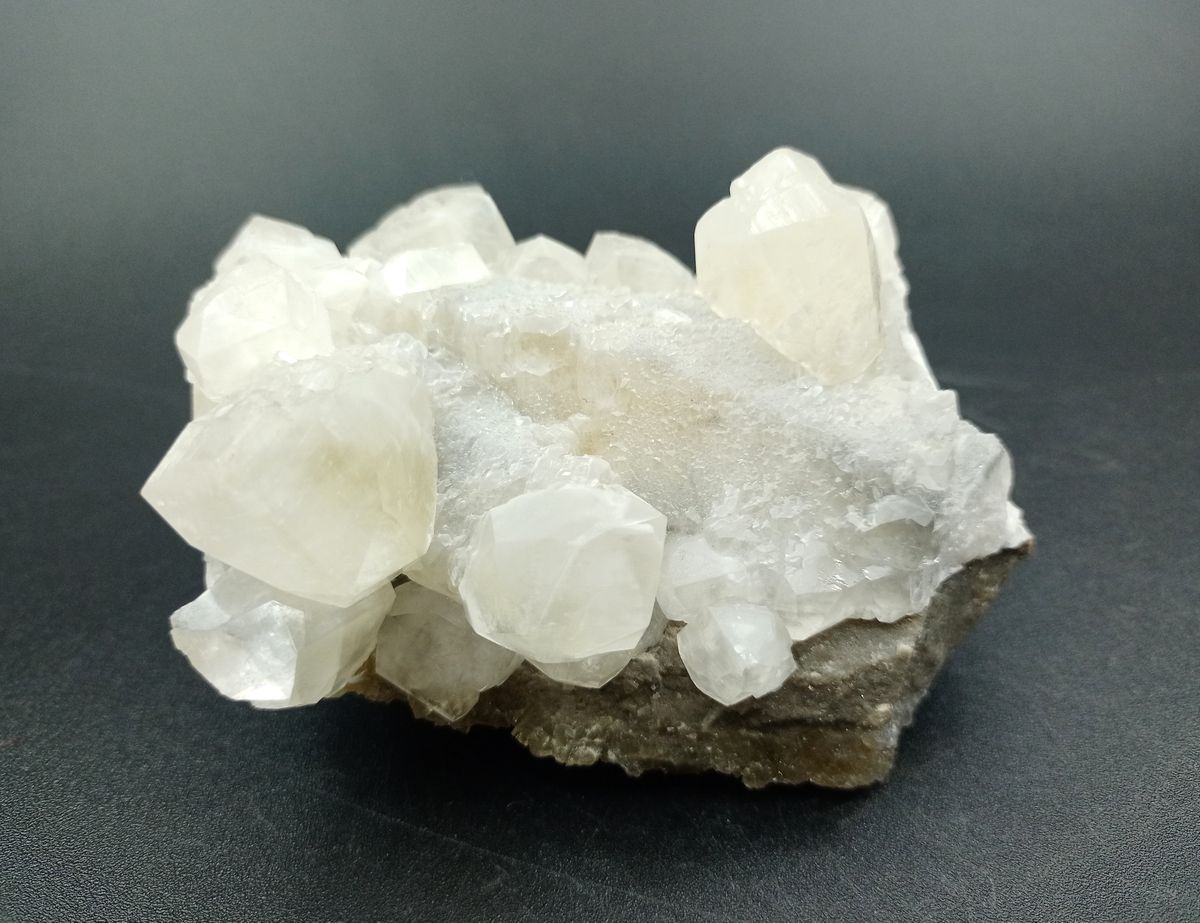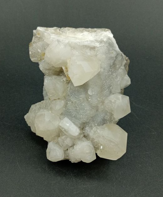 Ejemplar cuyas medidas son: 96x82x60 milímetros, midiendo los cristales más grandes de Calcita hasta 26 mm de ancho, con caras bien definidas, y combinaciones complejas. Procedencia: Mina Moscona, Solís, Asturias (España)