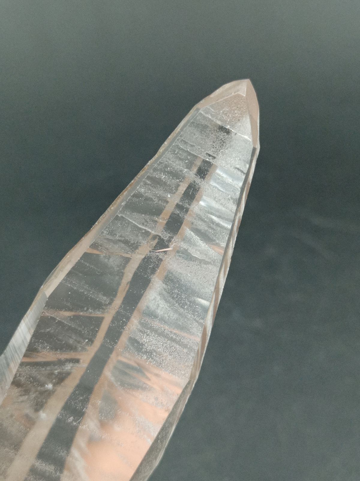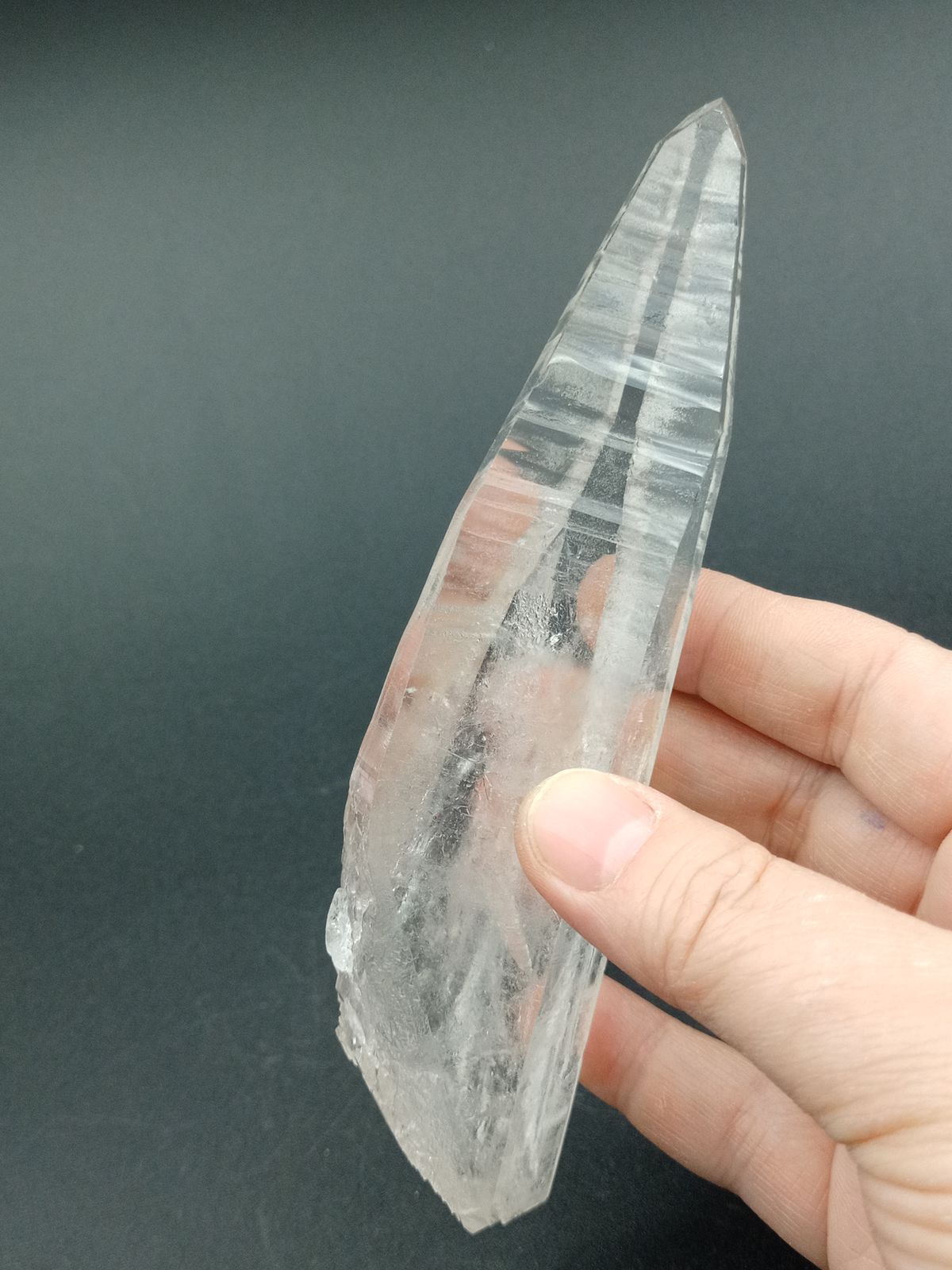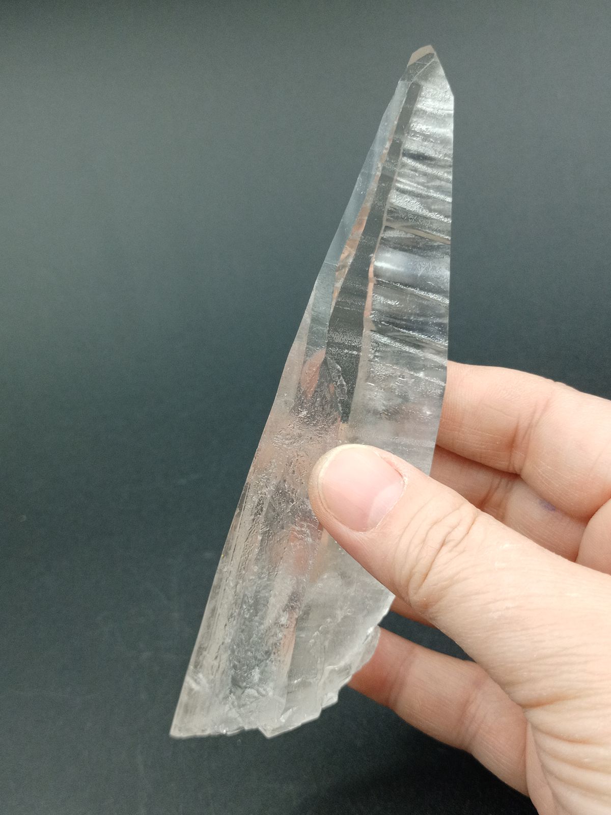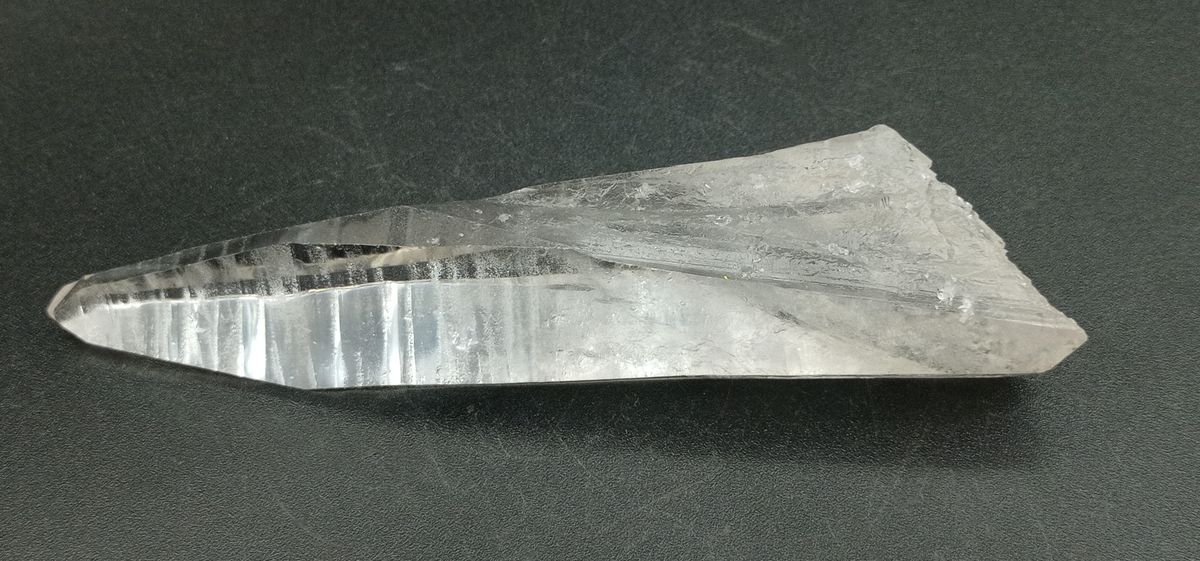 Punta de Cuarzo Lemuriano terminada en ambos extremos. Tamaño de las pieza 144 mm de largo x 35 mm en el extremo más grande Procedencia: Diamantina, Minas Gerais, Brasil.
