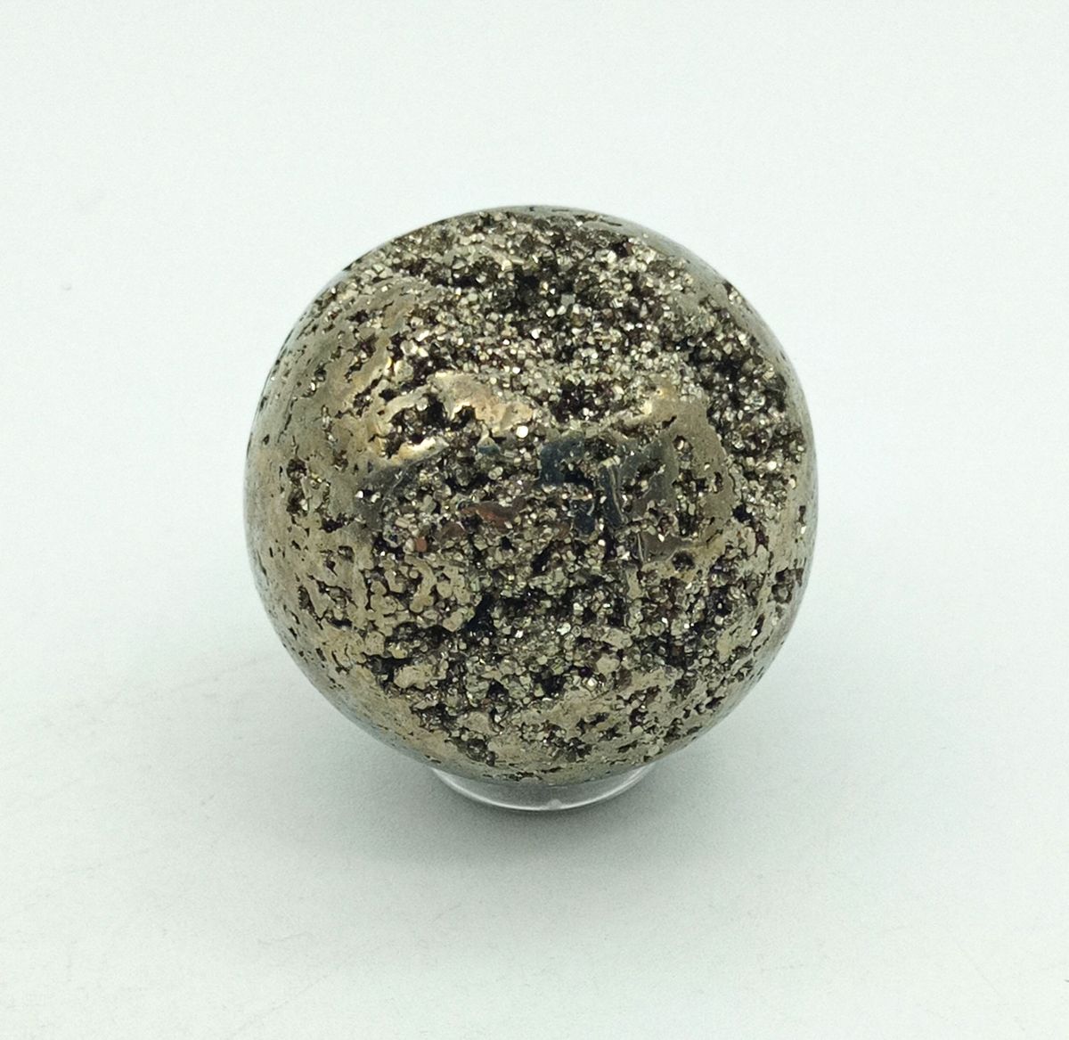 Esta talla en Pirita natural con forma de esfera presenta una geoda principal y otras de menos tamaño. La medida de la circunferencia de es 46 milímetros de diámetro. Procedencia: Perú