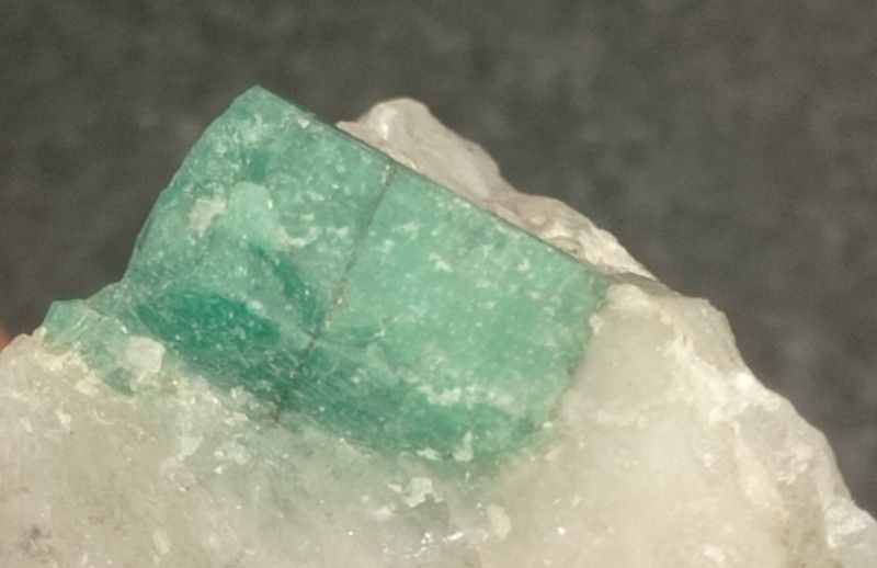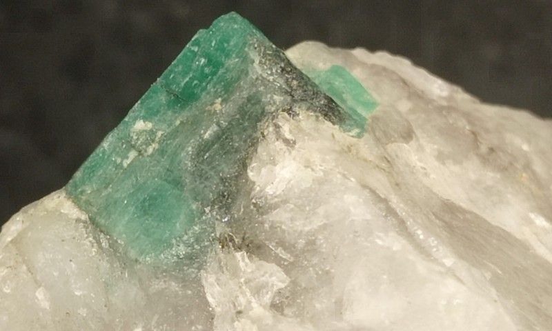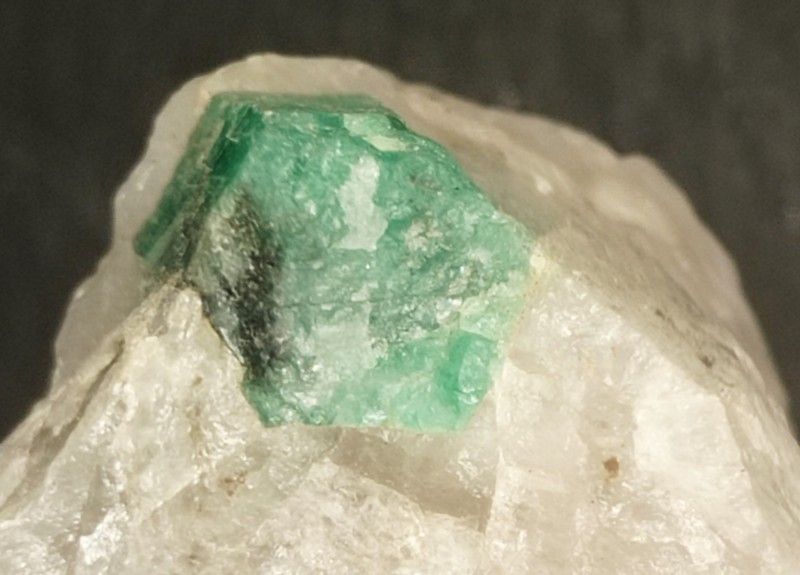 Cristal de color verde intenso, opaco, con caras bien definidas, ubicado en una masa compacta de cuarzo. La esmeralda es una variedad de berilo. Las variedades de mayor calidad han sido muy apreciadas en joyería desde tiempos remotos.
