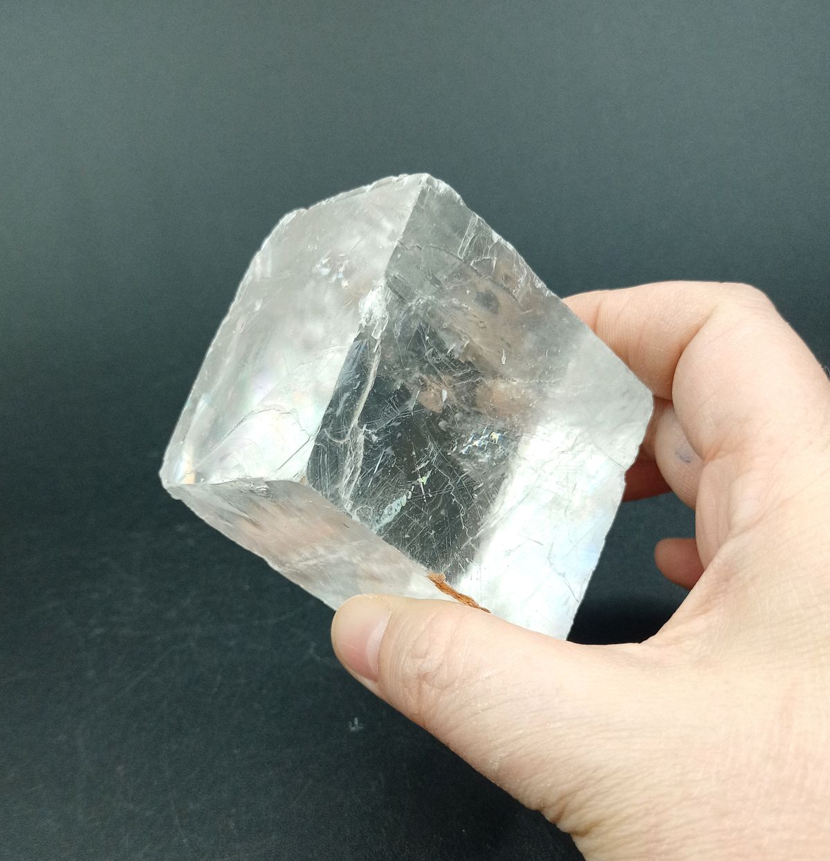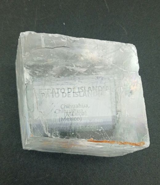 Calcita "Espato de Islandia" romboedro transparente cuyas medidas son: 62x57 por 37 milímetros de ancho. Procedencia: Chihuahua (México)
