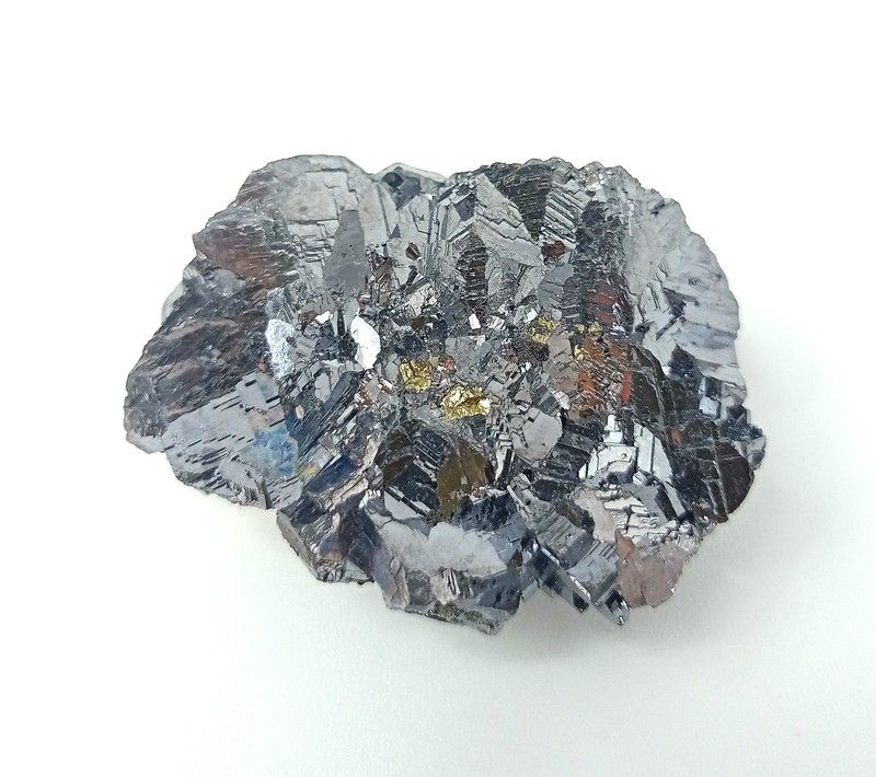 Pieza formada por galena, que se presenta en cristales cubo-octaédricos de color gris acero y brillo metálico intenso. La calcopirita se presenta en pequeños cristales dorados de brillo intenso.