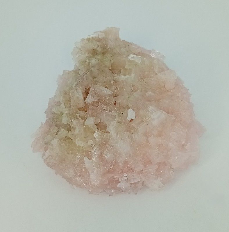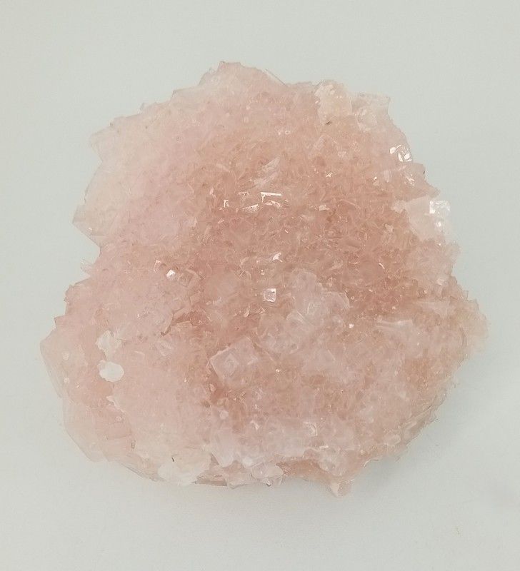 Pieza de Halita rosa cristalizada cuyas medidas son: 95x89x52 milímetros. De tonalidades variadas según la zona de la pieza, siendo predominante el color rosa. Procedencia: Searles Lake, Trona, Inyo County, California (USA).