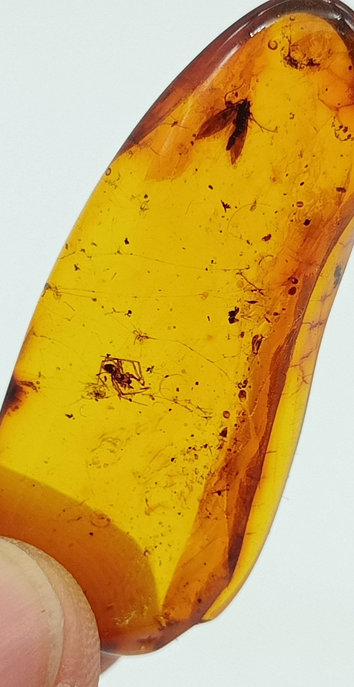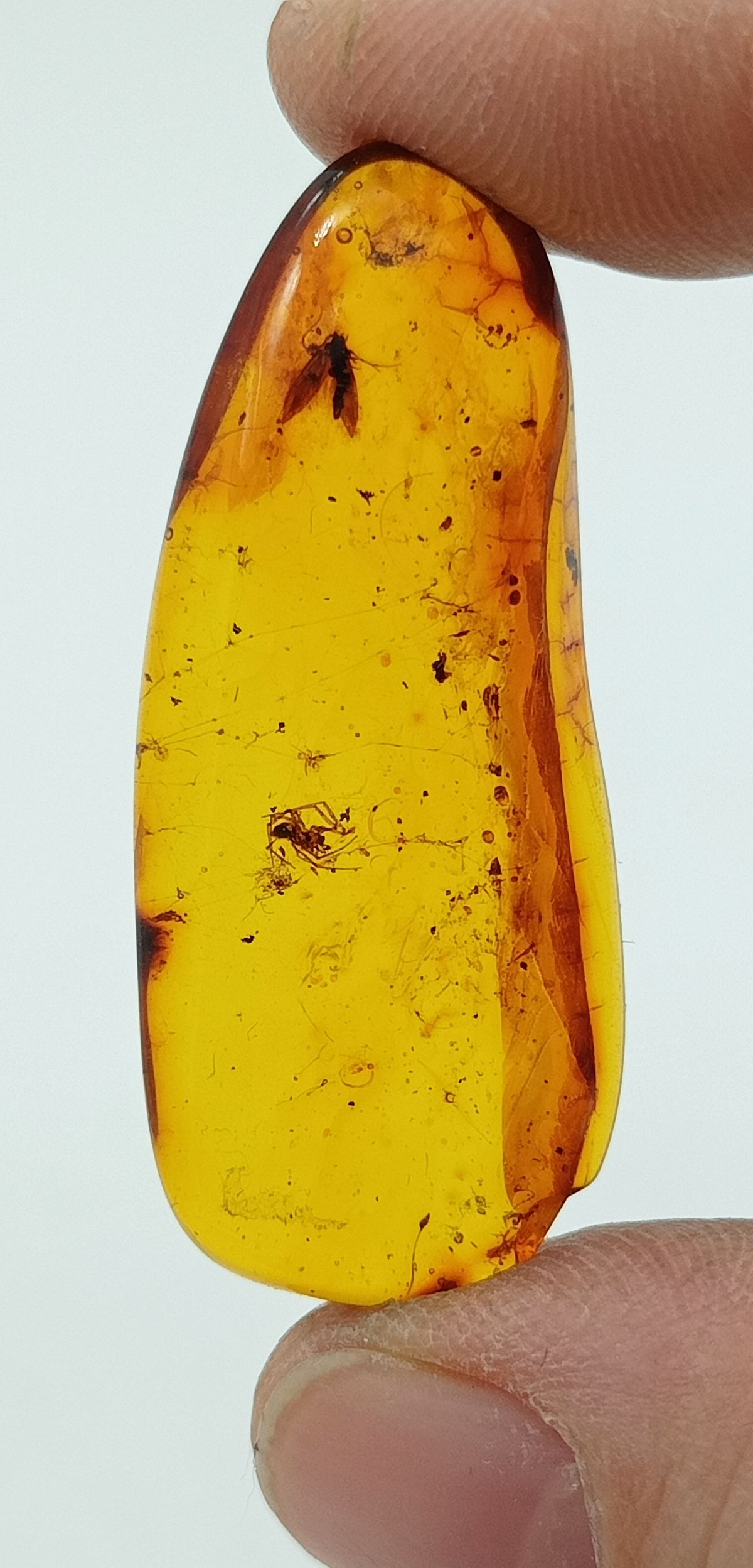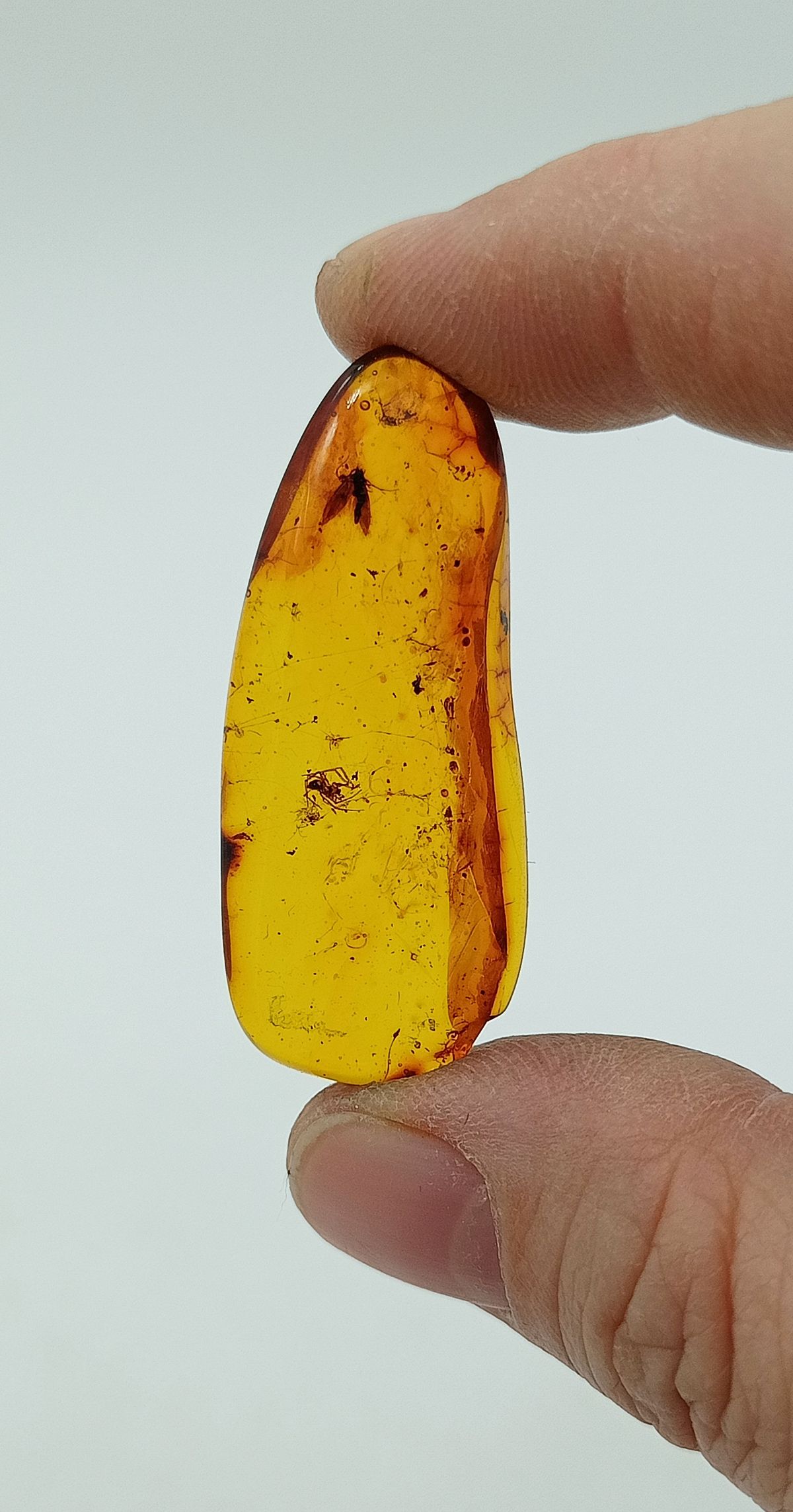 Ejemplar de 40x17 mm Midiendo de ancho 6 mm. Esta pieza contiene 2 insectos atrapados en su interior. El insecto mayor mide hasta 4 mm. Oligoceno superior. 25 millones de años. Procedencia: Yantharny (Rusia)