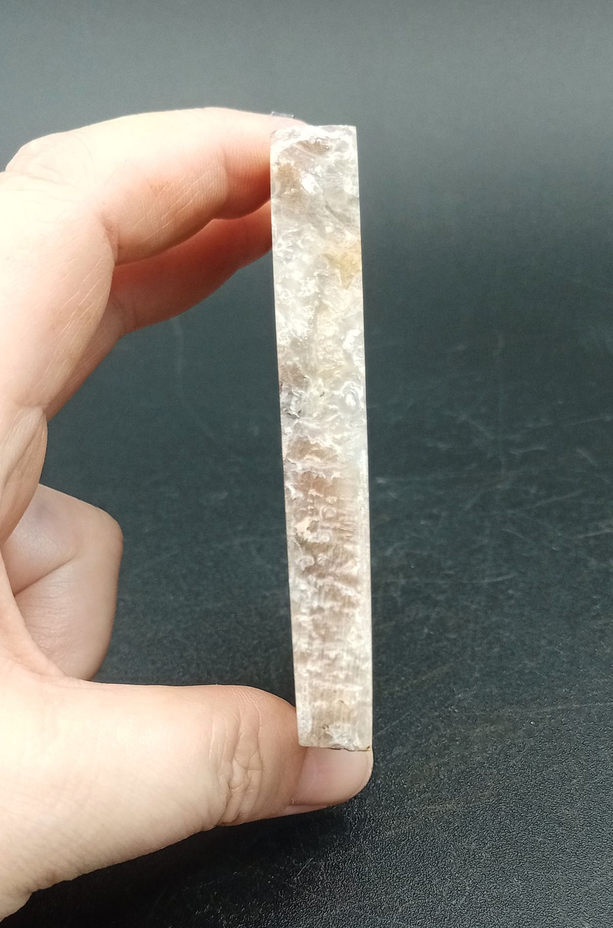 Placa de Adularia cuyas medidas son: 76x73 mm por 11 mm de ancho. Ambas caras están pulidas.