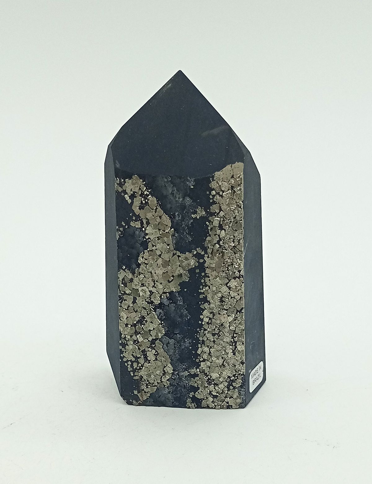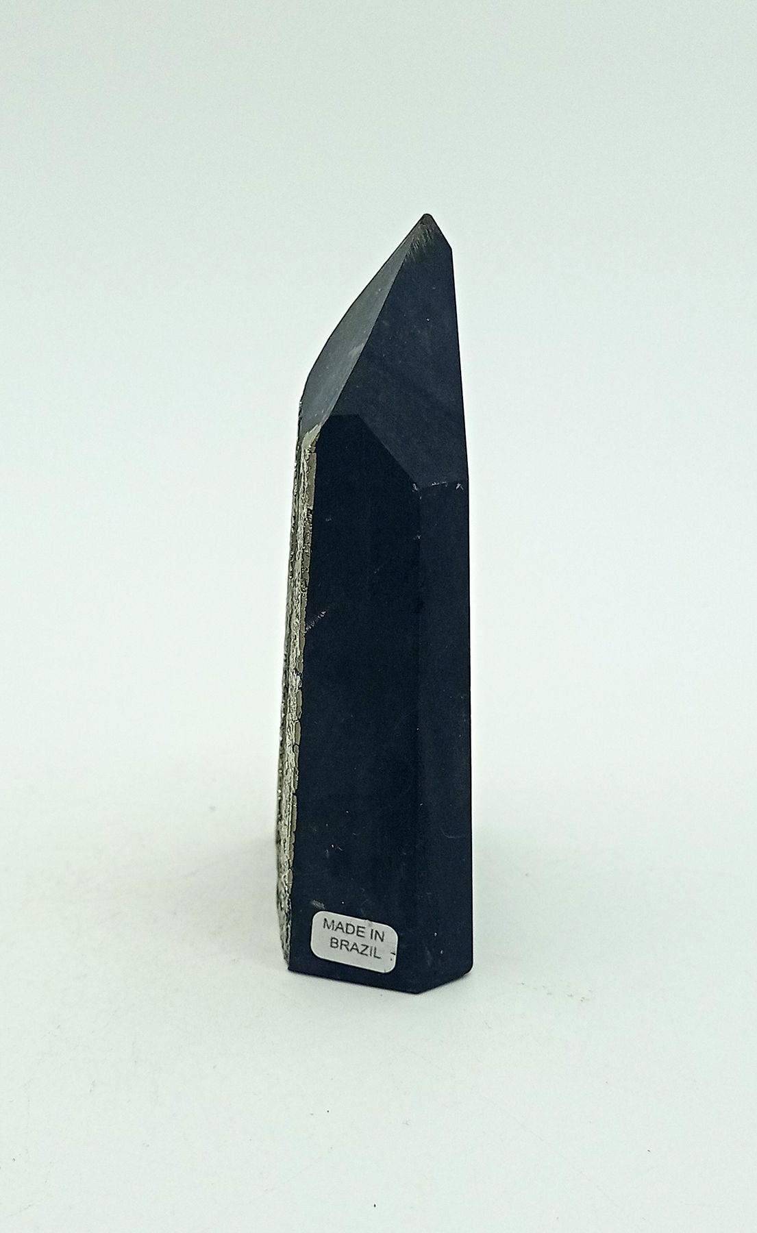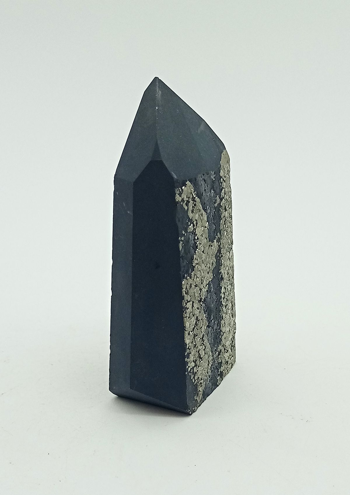 Esta punta tallada en Shungita tienen una cara con inclusiones de Pirita y sus medidas son: 105x57x29 milímetros.