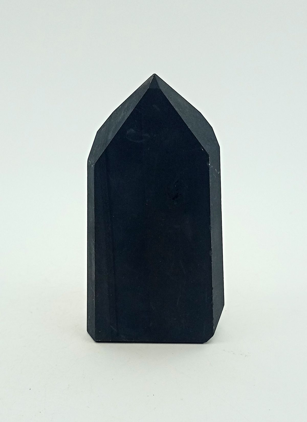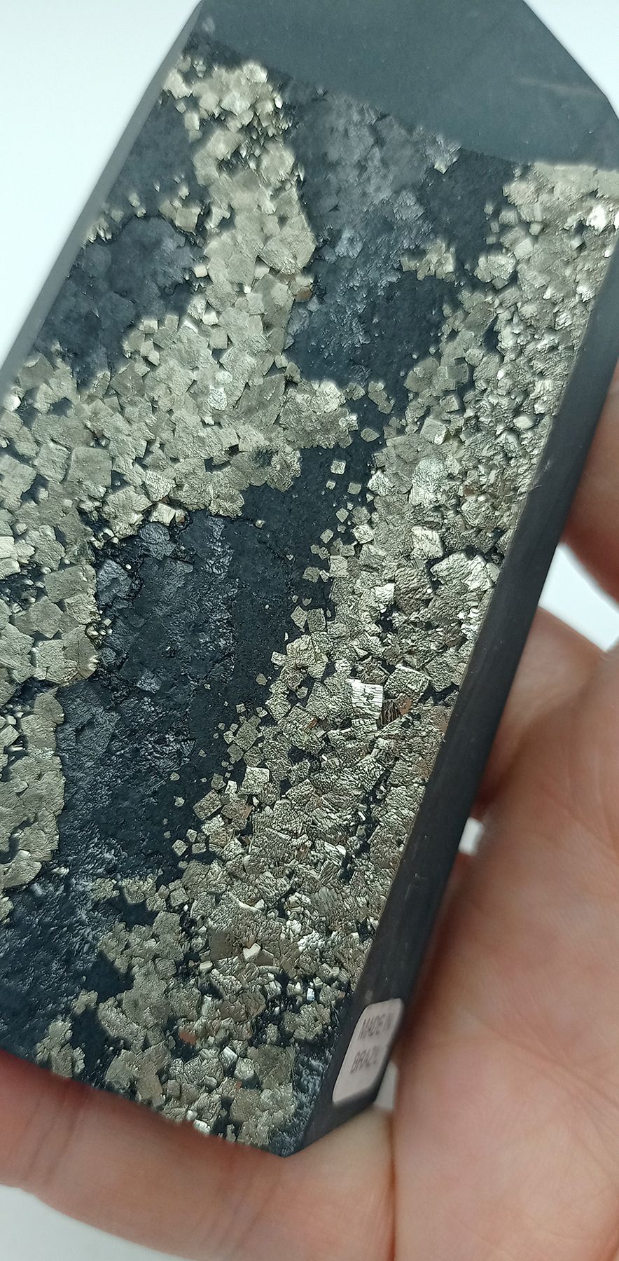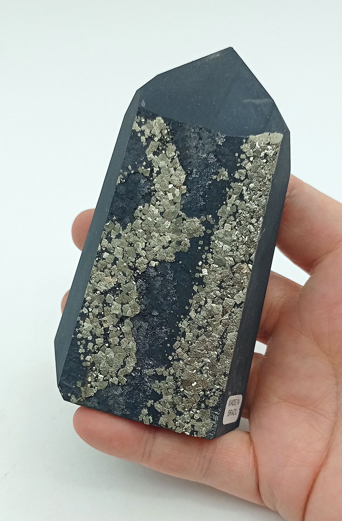 Esta punta tallada en Shungita tienen una cara con inclusiones de Pirita y sus medidas son: 105x57x29 milímetros.