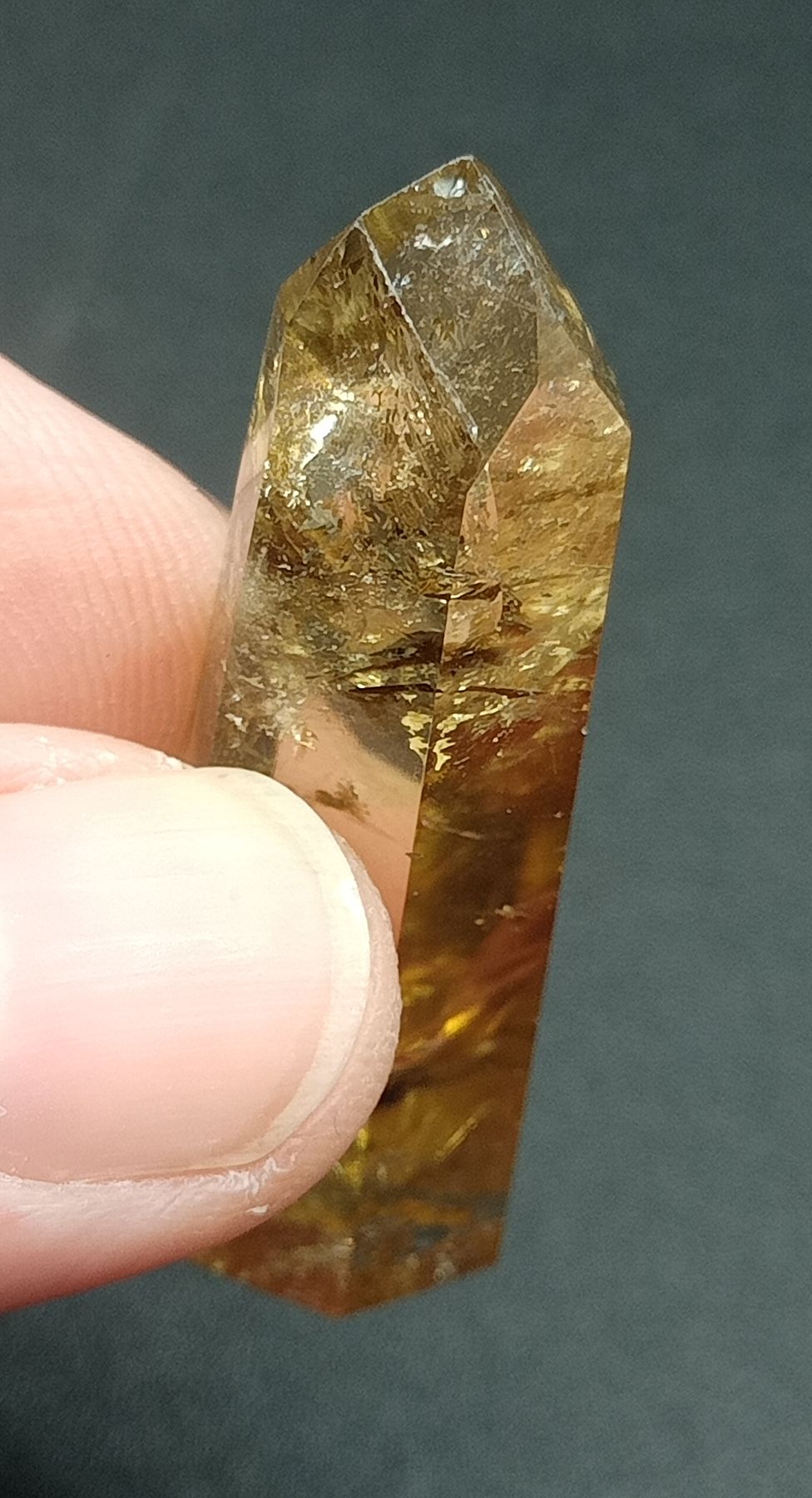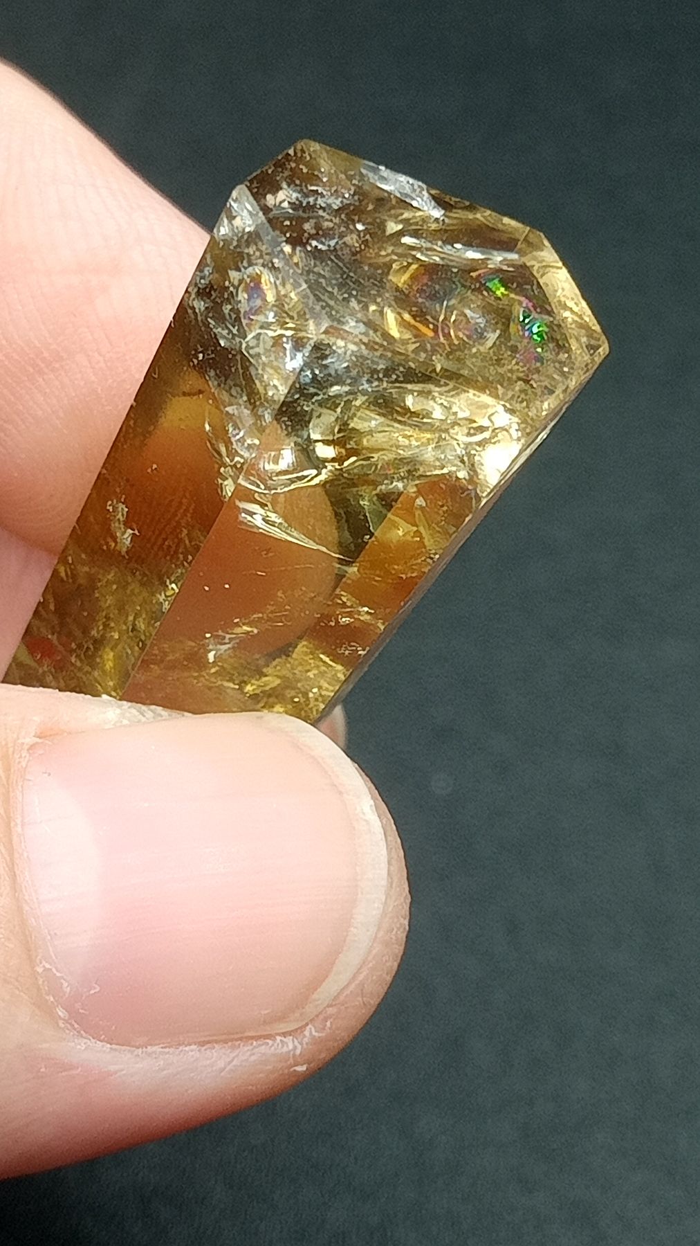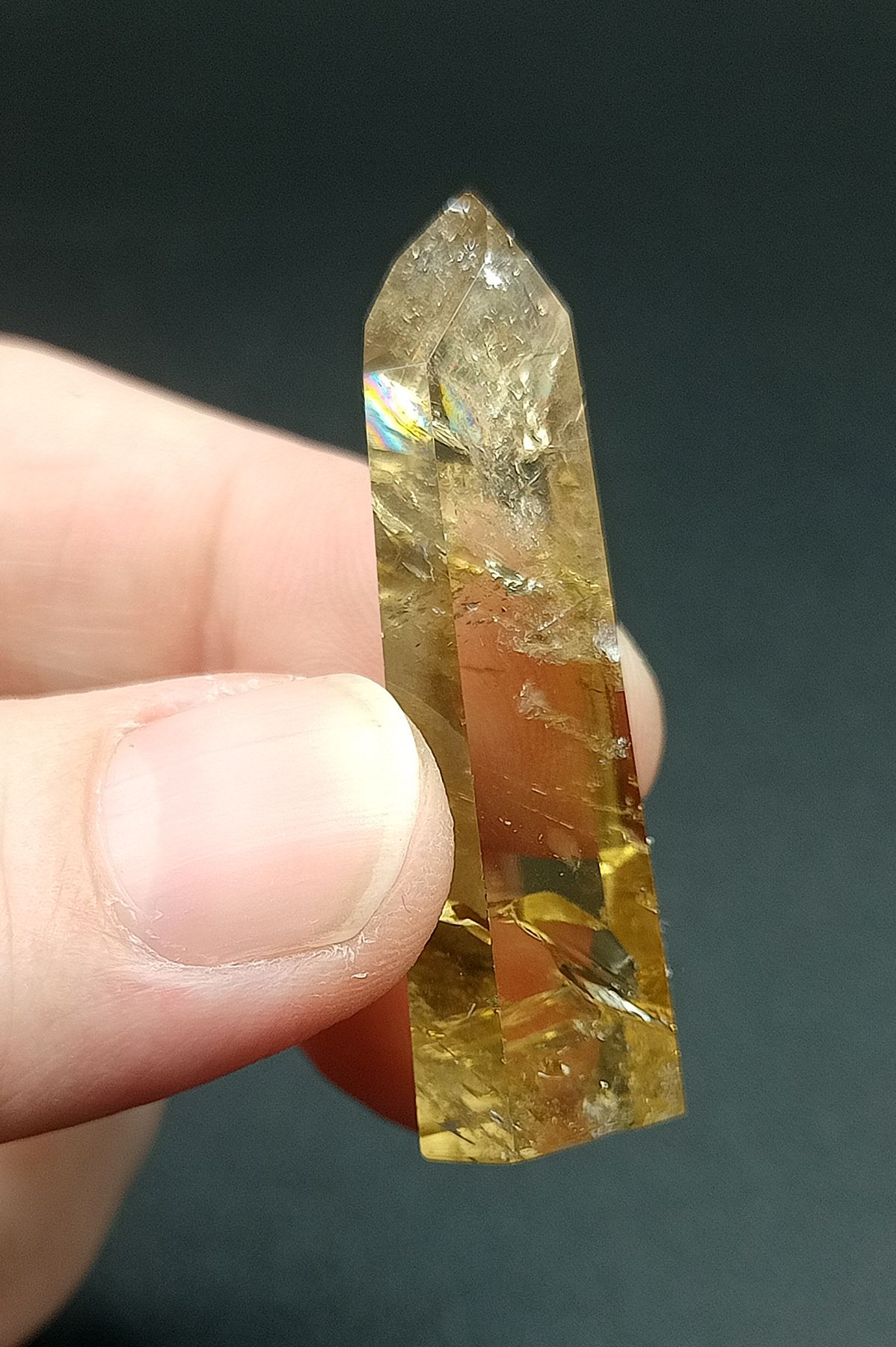 Esta punta de Citrino natural tiene calidad extra y presenta una coloración amarillo/dorado fuerte.