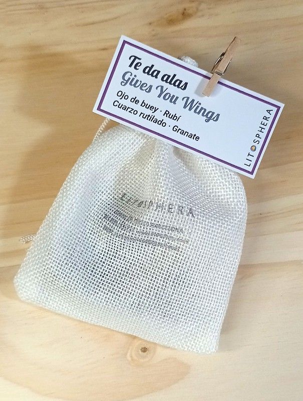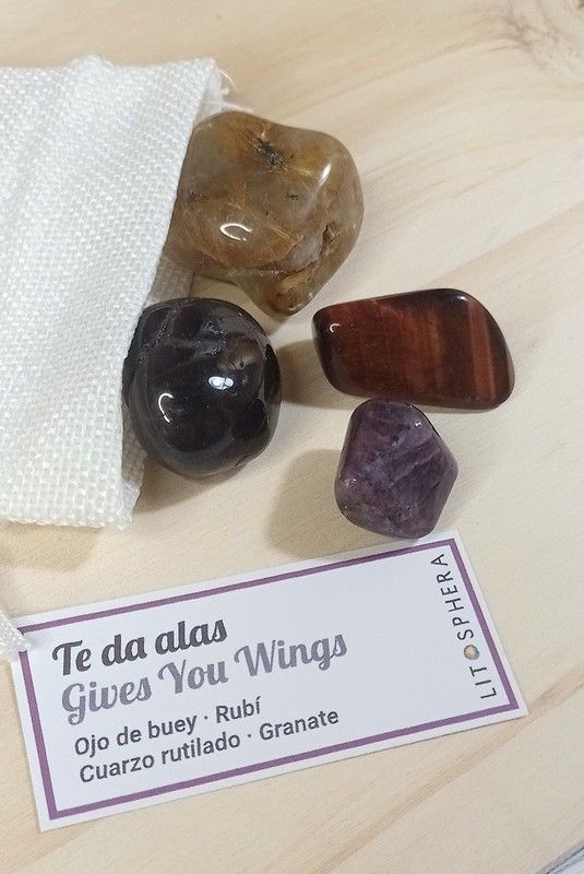 Serie CARPE DIEM. Set "Te da alas" consta de: 1 rodado de Ojo de buey, 1 rodado de Rubí, 1 rodado de Cuarzo rutilado y 1 rodado de Granate. El conjunto viene en un saquito de tela.